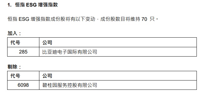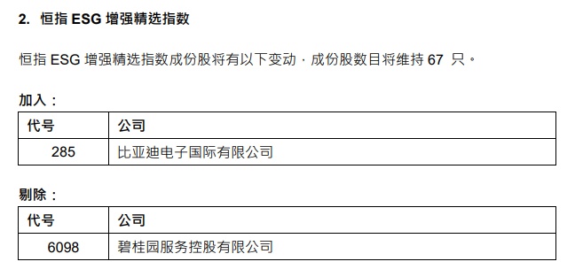 恒指ESG增强精选指数成份股数目将维持67只,加入比亚迪电子(00285),剔除碧桂园服务(06098)。