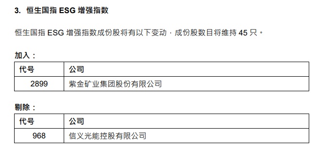 恒生国指ESG增强指数成份股数目将维持45只,加入紫金矿业(02899),剔除信义光能(00968)。