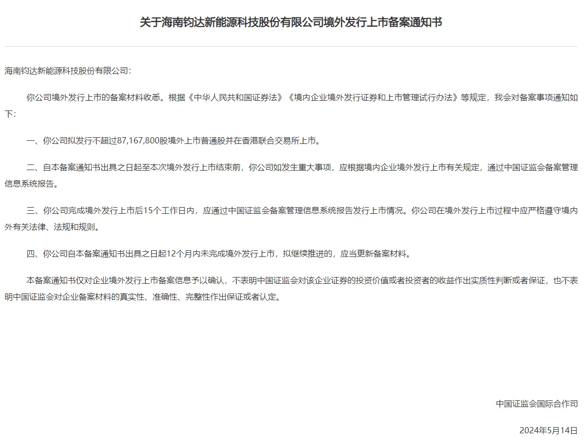 智通财经APP获悉,5月17日,中国证监会发布《关于海南钧达新能源科技股份有限公司境外发行上市备案通知书》。该公司拟发行不超过87,167,800股境外上市普通股并在香港联合交易所上市。据悉,2月6日,钧达新能源向港交所递交上市申请,华泰国际、招银国际、德意志银行为其联席保荐人。