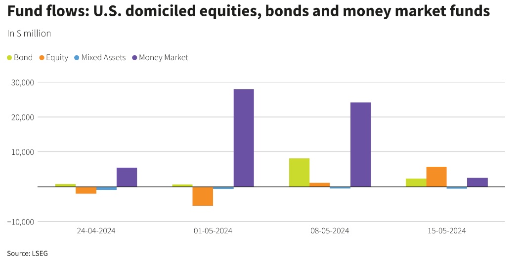 智通财经获悉,在截至5月15日的七天里,受美国就业数据疲弱且通胀逊于预期后美联储降息预期升温推动,美国股票基金吸引了大量资金流入。LSEG数据显示,投资者向美国股票基金净注入57.8亿美元,为3月20日以来最大单周资金流入。周三公布的报告显示,美国4月CPI放缓,这增强了市场对年底前将降息两次的预期。