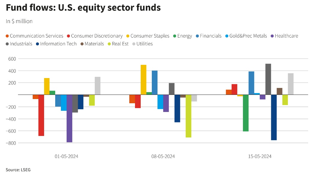 行业股票基金在连续六周净流出后,仅获得2200万美元资金流入。工业、金融和公用事业板块分别吸引了5.15亿美元、3.85亿美元和3.59亿美元的净流入。科技股的净抛售额约为7.57亿美元。