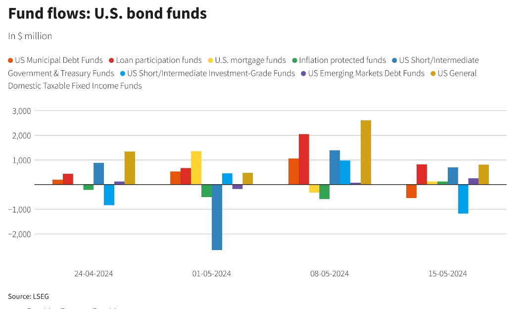 美国债券基金连续第四周吸引资金流入,净增约23.9亿美元。投资者将8.15亿美元净分配给美国贷款参与基金,8.12亿美元分配给一般美国国内应税固定收益基金,6.98亿美元分配给短期/中期政府和国债基金。然而,美国短期/中级投资级债券基金经历了大幅回调,净流出11.8亿美元,为2023年11月8日以来最大。