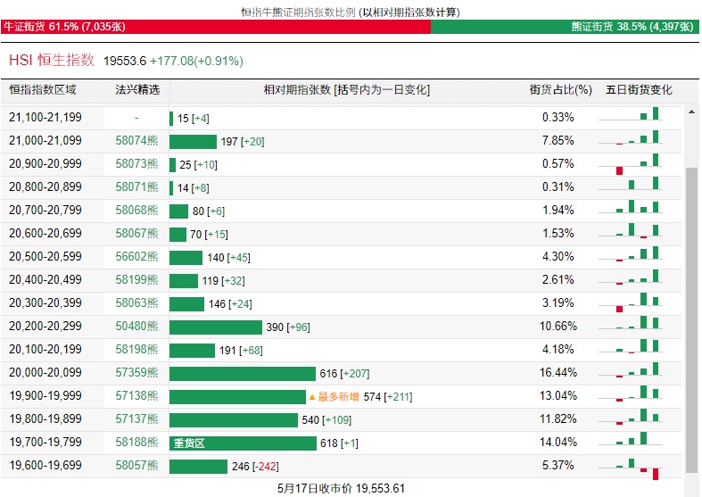 智通财经APP获悉,截至5月18日,恒指最新的牛熊街货比例为61.5:38.5。