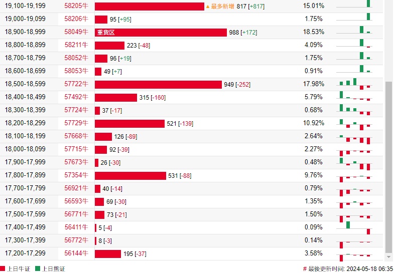 牛证街货重货区在18900-18999区间,该区间最新牛证数量为988张,较上一交易日增加172张;最多新增在19100-19199区间,该区间最新牛证数量为817张,较上一交易日增加817张。