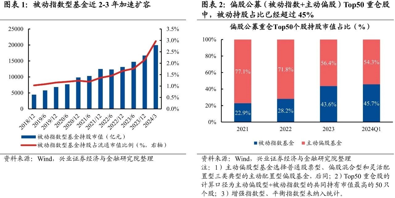 近年被动基金持续扩容,在基金重仓股中的持股占比持续提升,其边际增量对市场的影响也更加显著。相比主动基金,被动基金年初以来增量更为显著。被动指数型基金近2-3年加速扩容,截至2024Q1末,被动指数型基金持有A股的市值已经上升至19960亿元左右。更重要的是,当前偏股公募基金重仓市值居前的个股中,被动基金的持股占比持续抬升,其对市场风格的影响也更为显著。至2024Q1末,偏股公募基金(被动指数+主动偏股)的Top50重仓股中,被动基金的持股占比已经跃升至45.7%,较2021年末的22.9%几乎翻倍。