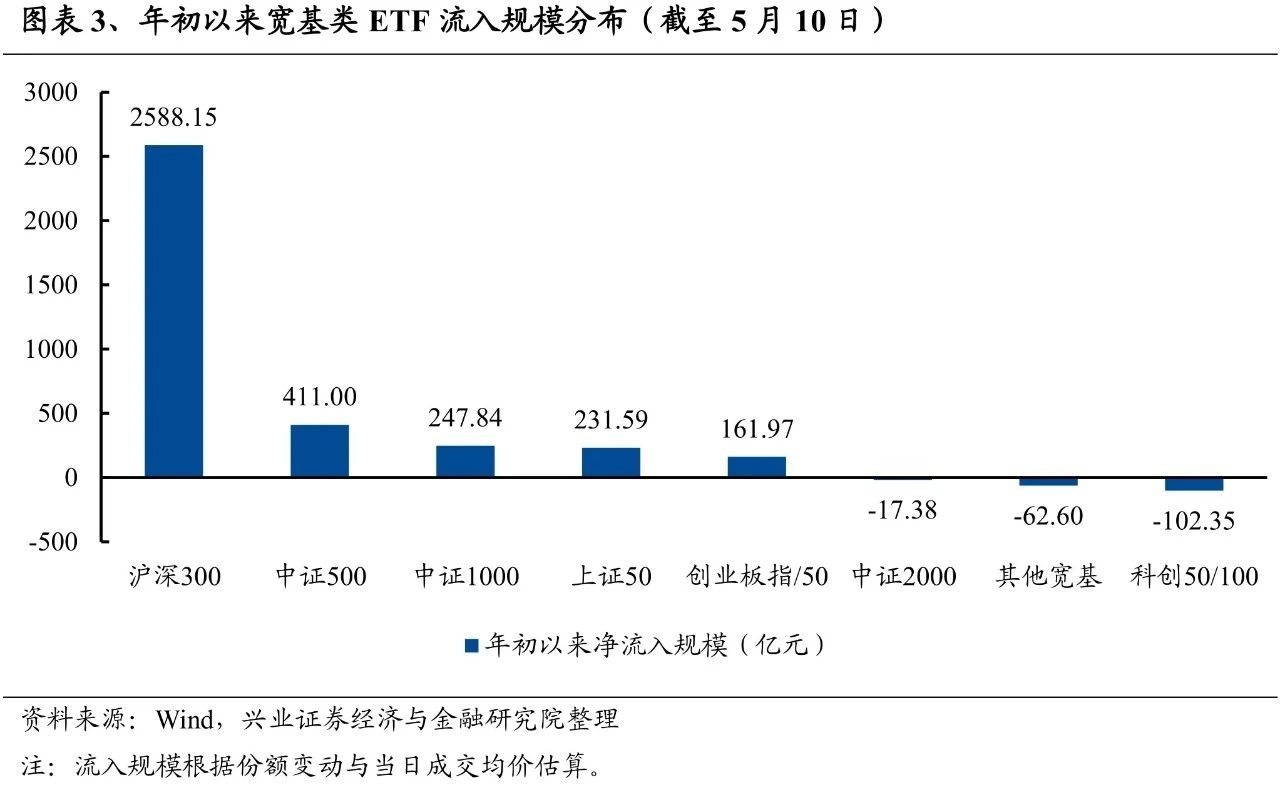 从产品结构来看,沪深300为代表的大盘宽基类ETF获流入最多。截至5月10日,今年以来股票型ETF净流入3273.64亿元,其中宽基类ETF净流入3458.21亿元,其他类小幅净流出。宽基类ETF是核心增量来源,且其中流入最多的为跟踪沪深300指数的ETF产品(2588亿元、67.7%)。由此,沪深300指数今年也有显著的超额收益。
