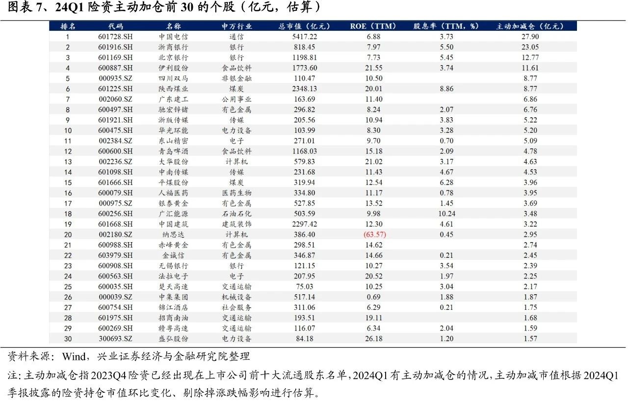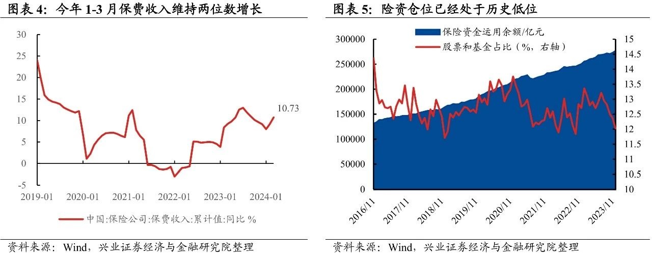 保费扩容,且加仓意愿有望迎来抬升。负债端来看,截至2024年3月,保险公司累计保费收入维持两位数的增长,预计带动险资继续流入。资产端来看,截至2023年底,险资的权益仓位已经处于历史低位,股票和基金占比回落至12.02%,后续随着市场修复,其加仓意愿有望抬升。