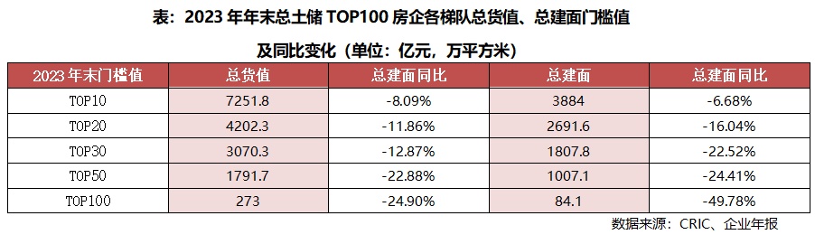 智通财经APP获悉,克而瑞研究中心发文称,截止2023年末,总土储货值TOP100房企的货值总量为29.3万亿元,较2022年末下降13.9%,TOP100企业总土储建面18.2亿平方米,同比降幅达到17.5%。总土储货值百强门槛值为273亿元,总土储建面百强门槛值为84.1万平方米,同比分别下降24.9%和49.78%,同比跌幅依然较大。分梯队来看,百强门槛值降幅最大,其次为50强门槛值,反之总土储10强门槛值仅下降8.09%,由此可见目前能够拿地的仍然是以头部企业为主。