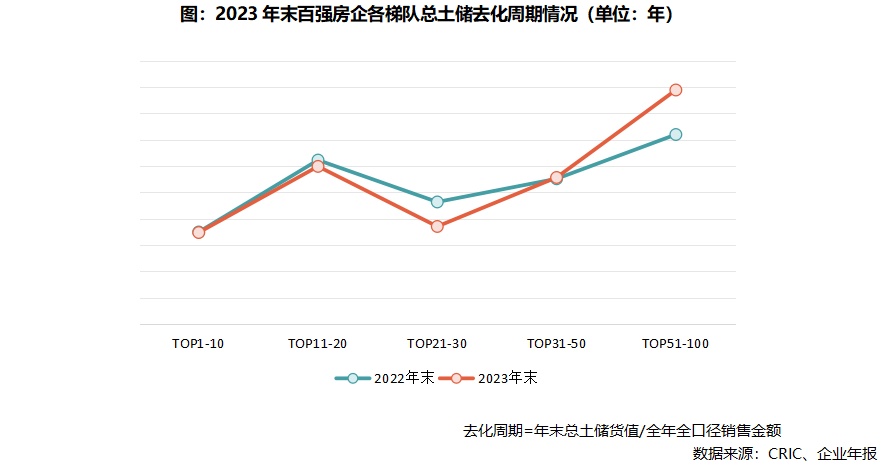 其次11-20强、21-30强房企去化周期与2022年末相比均有所下降,这两个梯队房企在控制拿地的同时也加大了去化力度;