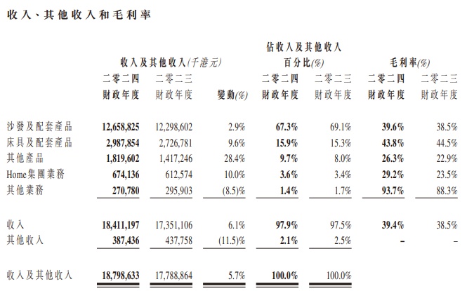 拆分营收结构,敏华控股的收入主要由沙发和床具产品贡献。2024财年,公司来源于沙发及配套产品的收入为126.6亿港元,占公司总收入的比重为67.3%,规模同比增幅为2.9%;同期,床具及配套产品贡献收入29.9亿港元,同比增加了9.6%,占总收入的比重为15.9%。
