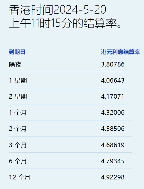 智通财经APP获悉,5月20日,据香港银行工会数据,港元拆息连续两个交易日全线向上,其中,隔夜息、一周拆息及一个月拆息齐创两周新高。隔夜息升近18基点报3.80786%,一周拆息升穿4%,高见4.06643%。与楼按相关的一个月拆息连升四天,报4.32006%。反映银行资金成本的三个月拆息升至4.68619%,重见4月2日高位。长息方面,六个月及一年期均升近4基点,分别报4.79345%及4.92298%。