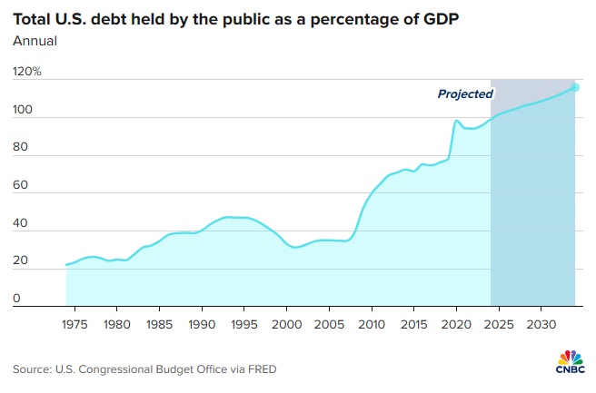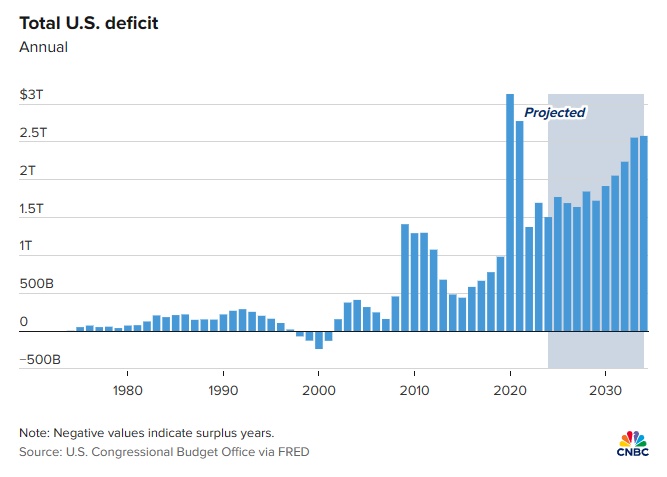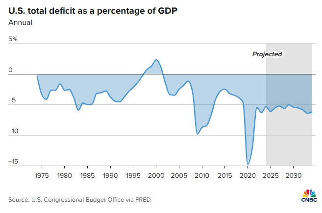 激增的预算赤字是债务的主要推动力之一,且国会预算办公室预计这种情况只会变得更糟。该机构预测,2024财年(2023年10月1日-2024年9月30日)美国将出现1.6万亿美元的预算赤字——前7个月的赤字已达到8550亿美元,到2034财年预算赤字将激增至2.6万亿美元。按预算赤字占GDP的比例看来,这一比例将在未来十年内从今年的5.6%增长至6.1%。