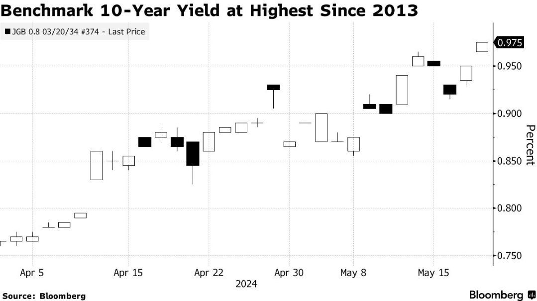 智通财经APP获悉,日本基准政府债券收益率近期攀升至2013年以来的最高水平,这一现象反映出市场对日本央行将致力于利率正常化并支持日元的预期。周一,日本10年期国债收益率上涨2.5个基点,达到0.975%,这一数字上次出现还是在黑田东彦担任日本央行前行长并开始实施激进货币宽松政策之时。