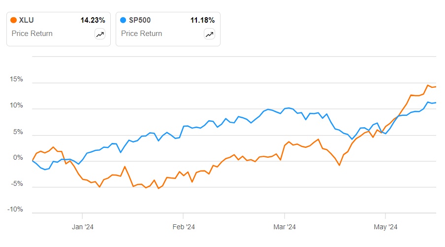 目前,该行业已经收复了2023年以来的所有跌幅,并且仅在5月就上涨了近8%。这主要是越来越多的人认为,公用事业板块将受益于人工智能(AI)的发展,从而推动了近期的优异表现。