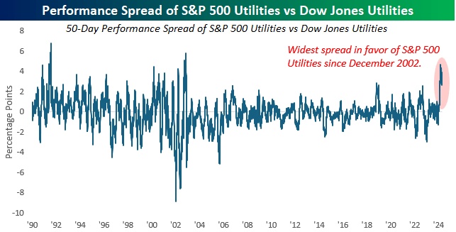 另外,Bespoke Investment Group在下图中强调了标普500指数中公用事业板块和道琼斯指数中公用事业板块最近的表现差距,并指出这是自2002年底以来的最大差距: