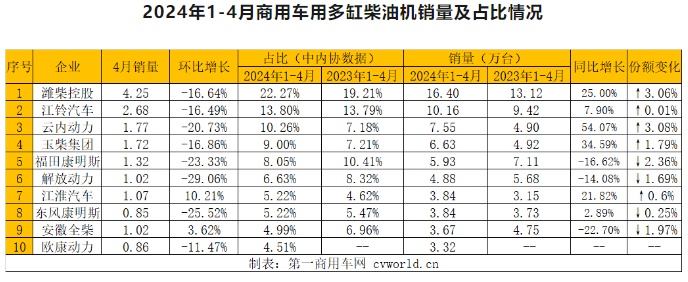 与商用车市场密切相关的商用车用多缸柴油机市场表现得则不尽如人意,环比同样出现下滑,同比实现小幅增长:2024年4月,商用车用多缸柴油机销售18.62万台,环比下降15.46%,同比增长5.19%;1-4月,累计销量73.62万台,同比增长7.82%,与1-3月相比增速下滑了接近1个百分点。销量前十企业分别是潍柴、江铃、云内、玉柴、福田康明斯、解放动力、江淮、东风康明斯、全柴、欧康动力,前十名销量占总销量的89.96%,与上月相比下降了0.3%。