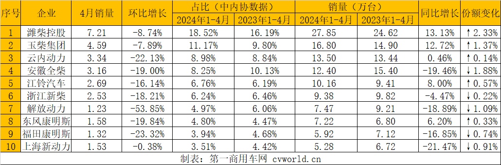 2024年4月,多缸柴油机企业共计销售37.81万台,环比下降17.28%,同比下降1.02%;1-4月,累计销量150.36万台,同比下降1.11%。其中,销量居于前十的企业分别是:潍柴、玉柴、云内(000903.SZ)、全柴、江铃、新柴、解放动力、东风康明斯、福田康明斯、上海新动力,与上月排名完全相同,前十名占多缸柴油机总销量的77.14%,与上月相比基本持平。