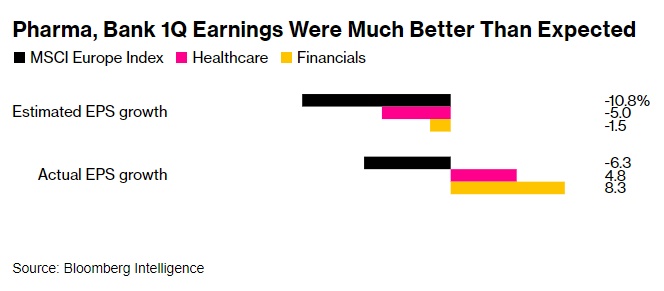 智通财经APP获悉,欧洲银行和制药巨头的强劲表现帮助推动了欧洲企业第一季度盈利意外超出市场预期,分析师认为,这也预示着未来业绩指引可能会被进一步上调。Bloomberg Intelligence的数据显示,金融和医疗保健是MSCI欧洲指数中仅有的盈利增长的细分行业,好于市场预期的下滑。总体而言,MSCI欧洲指数(几乎所有成分股都公布了业绩)6%的盈利跌幅好于11%的普遍预期。