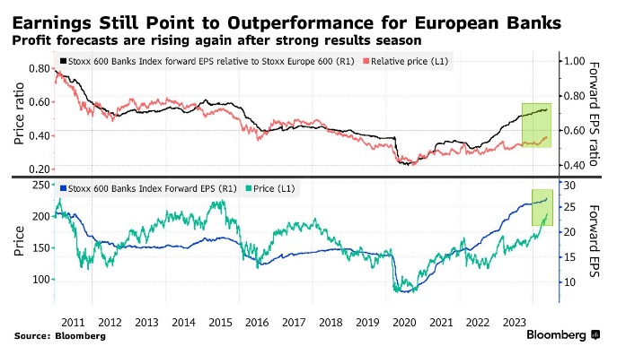 在银行业方面,Bloomberg Intelligence的数据显示,71%的欧洲银行第一季度的净利息收入超过了市场预期,西班牙、意大利和英国的银行业绩实现超预期,而北欧同行则不及预期。