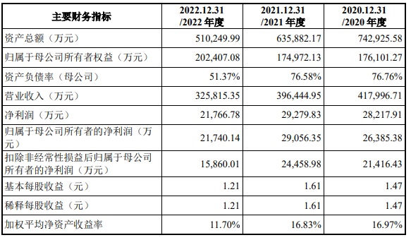财务方面,2020年度、2021年度、2022年收入约为41.8亿元、39.64亿元、32.58亿元,净利润分别约为2.82亿元、2.93亿元、2.18亿元。