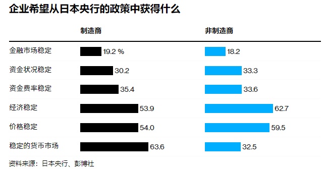 这项调查是日本央行对过去25年货币宽松政策进行评估的一部分。在企业优先考虑的事项中,价格和经济稳定排名第二,有54%的受访者选择了这一点。