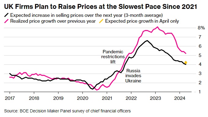 本月早些时候,英国央行行长贝利曾暗示,第一次25个基点的降息最快可能在6月20日进行,即下一次会议,也是布罗德班特离任前的最后一次会议。本周,英国国家统计局将公布4月份的通胀数据,市场普遍预计,通胀率将回落至2%的目标。而在下一次投票前,英国央行还将获得一组通胀和薪酬数据。