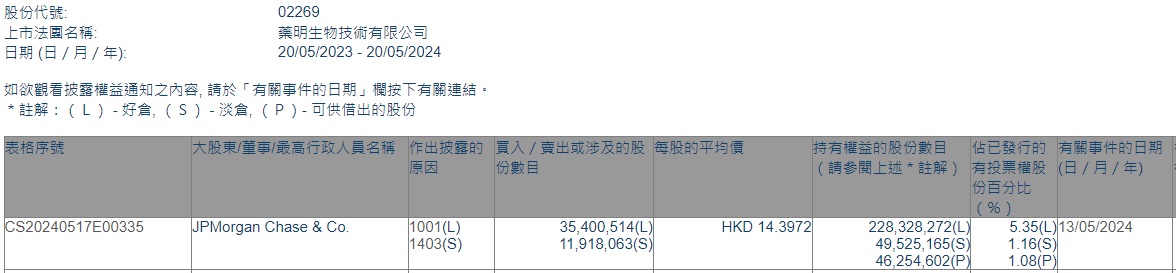 智通财经APP获悉,香港联交所最新资料显示,5月13日,小摩增持药明生物(02269)3540.0514万股,每股作价14.3972港元,总金额约为5.10亿港元。增持后最新持股数目约为2.28亿股,最新持股比例为5.35%。