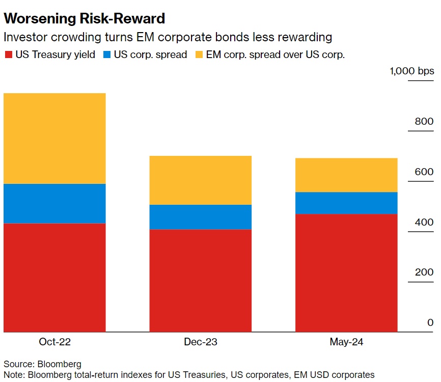 不断恶化的风险回报——投资者们集体涌入新兴市场债市,使得新兴市场公司债券的收益率明显降低