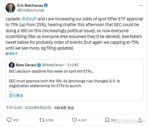 彭博分析师James Seyffart在X平台发文称:“简而言之,Eric Balchunas将现货以太坊ETF批准的几率提高到75%。但这是针对5月23日VanEck截止日期的19b-4文件。我们还需要S-1文件的批准。在看到S-1文件批准和实际以太坊ETF上线之前,可能需要几周到几个月的时间。话虽如此,如果我们的判断是正确的,并且我们在本周晚些时候看到这些理论上的批准,那么S-1文件的批准问题将是‘何时’而不是‘是否’。”