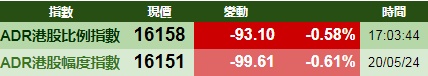 智通财经APP获悉,周一美股三大指数涨跌不一,港股ADR指数下跌,按比例计算,收报16158点,较香港收市下跌93.10点或0.58%。