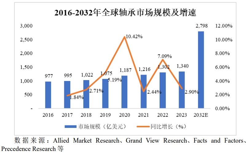 根据Precedence Research的数据,2023年,全球轴承行业市场规模达到1,339.9亿美元,预计到2032年全球轴承行业市场规模将达到2,798亿美元,复合年均增长率约为8.5%。目前,全世界已生产的轴承品种超过5万种,规格超过15万种。最小的轴承内径小到0.15-1.0毫米,重量为0.003克,最大的轴承外径达40米,重340吨。