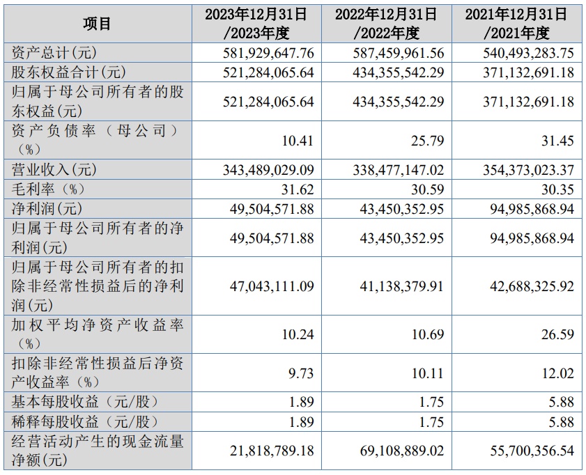 财务方面,于2021年度、2022年度及2023年度,公司实现营业收入分别约为3.54亿元、3.38亿元、3.43亿元。公司净利润分别约为9498.59万元、4345.04万元、4950.46万元人民币。