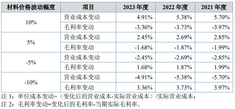 在公司未采取降本措施及未将材料价格上涨向客户传导的情形下,原材料价格分别上浮 5%、10%及分别下降 5%、10%,对发行人报告期内营业成本及毛利率的影响敏感性分析如下: