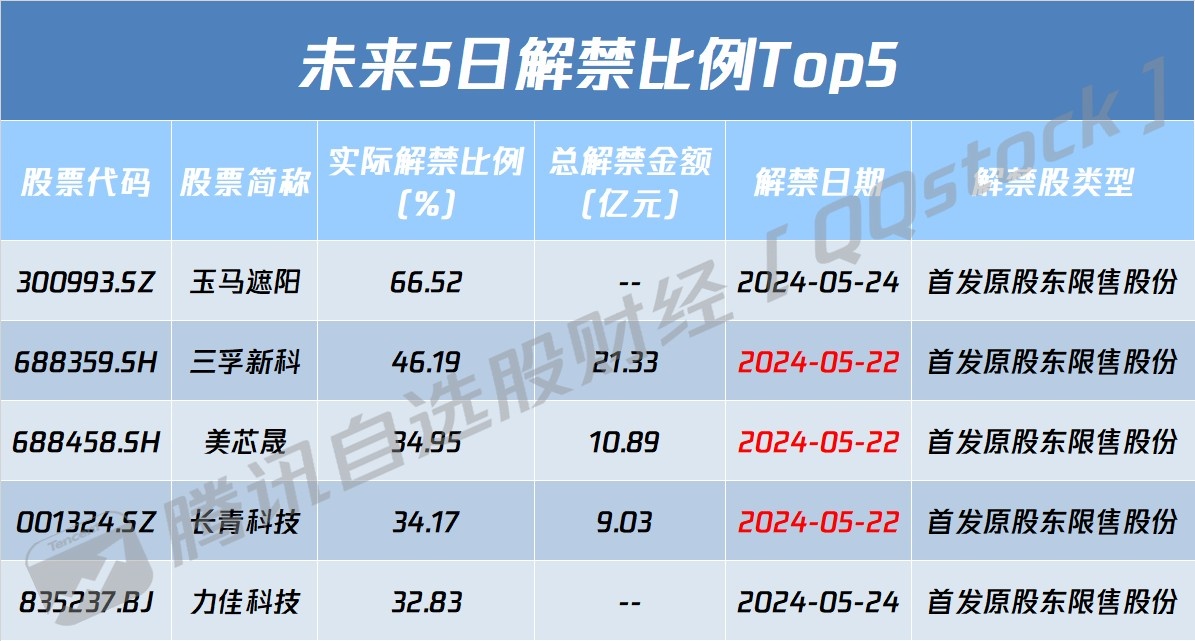 从解禁比例来看,未来5日玉马遮阳实际解禁比例达66.52%,其次解禁比例居前的分别为三孚新科、美芯晟。
