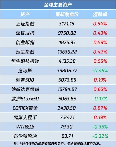 自选哥提示,隔夜美股三大指数走势分化,纳指收涨0.65%创历史新高;人民币资产集体走弱,中概指数跌1.65%,离岸人民币小幅贬值;COMEX 6月黄金期货收涨0.87%,报2438.5美元/盎司;WTI 6月原油期货收跌0.35%,报79.3美元/桶。