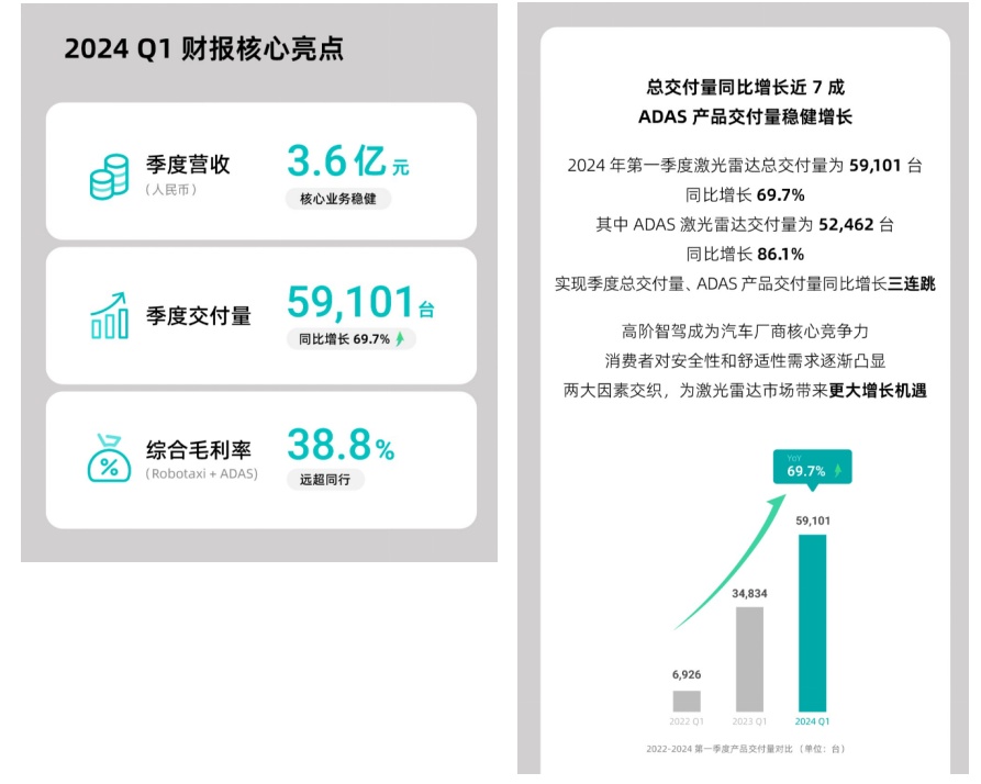 第一季度,禾赛科技实现营收3.6亿元人民币;激光雷达总交付量达59,101台,同比增长69.7%;其中ADAS产品交付量为52,462台,同比增长 86.1%。Robotaxi业务和ADAS业务综合毛利率为38.8%,展现了出色的经营效率和商业化能力。