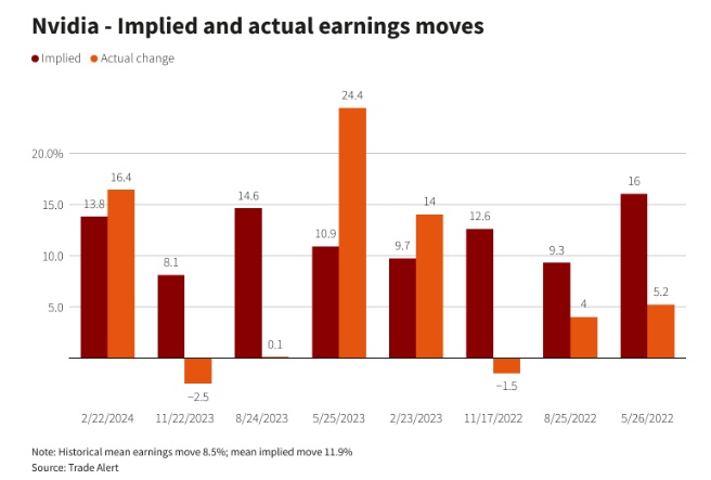 Alert的数据,英伟达股价在财报公布后的预期波动幅度为8.7%,这将意味着市值波动达 2000 亿美元,高于标准普尔 500 强公司约 90%