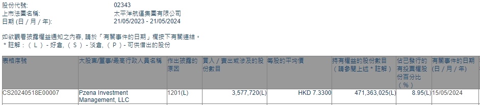 智通财经APP获悉,香港联交所最新资料显示,5月15日,Pzena Investment Management减持太平洋航运集团(02343)357.7720万股,每股作价7.33港元,总金额约为2622.47万港元。减持后最新持股数目约为4.71亿股,最新持股比例为8.95%。