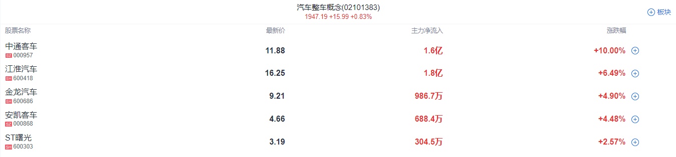 汽车整车股午后震荡反弹,江淮汽车大涨6%,中通客车涨停,安凯客车、北汽蓝谷、宇通客车等跟涨。