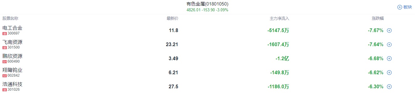 近期火热的有色金属、贵金属、工业金属等金属概念大幅回调,飞南资源、电工合金、湖南黄金、赤峰黄金、银泰黄金等多股大跌。