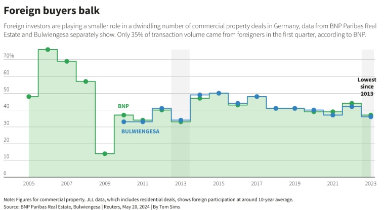 法国巴黎银行的数据显示,2023年,外国投资者占德国商业地产交易量的37%,为过去十年来的最低水平。这一比例在第一季度进一步下滑至35%。
