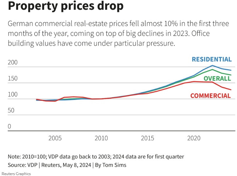 根据VDP银行协会的数据,继2023年下跌10.2%之后,德国商业地产价格在2024年的前三个月又下跌了9.6%,预计未来还会有更多的痛苦。