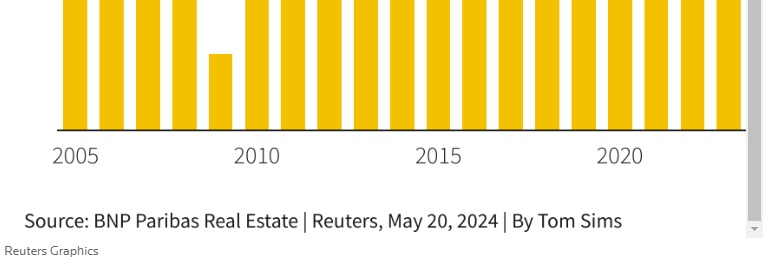 智通财经APP注意到,法国巴黎银行房地产公司的数据显示,今年第一季度,外国买家占商业地产购买量的35%。这比2013年以来的任何一年都要少,而且与2020-2021年之前的水平相比,销量下降了70%。