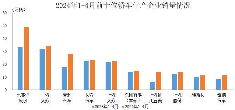 智通财经APP获悉,5月21日,据中国汽车工业协会统计分析,2024年1-4月,销量排名前十位的轿车生产企业共销售222.5万辆,占轿车销售总量的67.8%。在比亚迪股份、一汽大众、吉利汽车、长安汽车等十家企业中,与上年同期相比,十家企业销量均呈不同程度增长,其中上汽通用五菱增速最为显著。