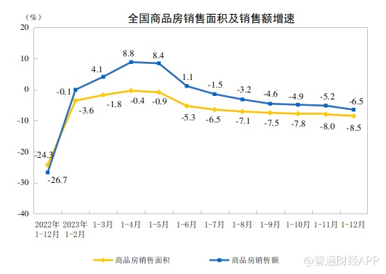 纵观2023年全年房地产市场走势,行业投资信心仍未改善,房企投资相对谨慎;各项利好政策支持下,房企融资环境宽松,但市场活跃度不足,购房者置业情绪仍偏弱。2023年全国商品房销售面积为11.2亿㎡,同比下降8.5%;商品房销售额为11.7万亿元,同比下降6.5%。