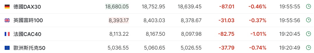2. 截至发稿,德国DAX指数跌0.46%,英国富时100指数跌0.37%,法国CAC40指数跌1.01%,欧洲斯托克50指数跌0.74%。