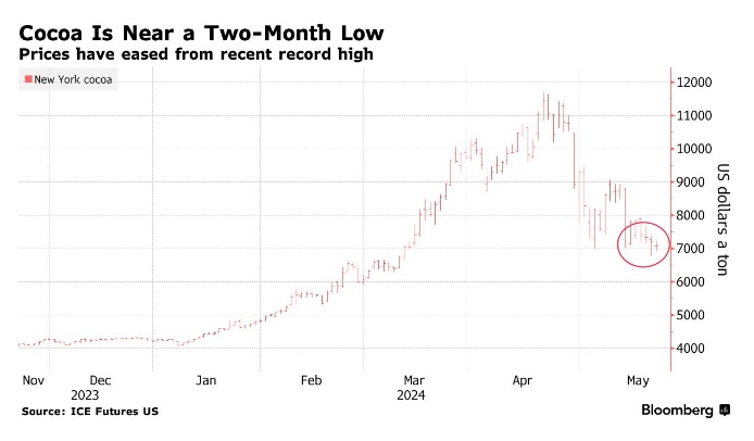 数据显示,可可期货价格一度下跌4.2%,至每吨7000美元以下。4月中旬,由于非洲收成不佳令市场不安,可可价格一度飙升至11000美元上方的纪录高位。但随着主要种植国近期降雨缓解了对供应的担忧,价格有所回落,一些分析人士甚至认为,这轮涨势已经见顶。
