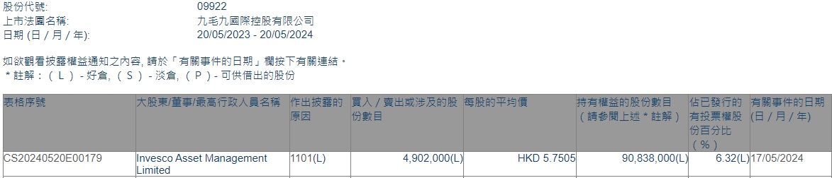 智通财经APP获悉,香港联交所最新资料显示,5月17日,景顺资产管理增持九毛九(09922)490.2万股,平均每股作价5.7505港元,总金额约为2818.9万港元。增持后最新持股数目为9083.8万股,最新持股比例为6.32%。