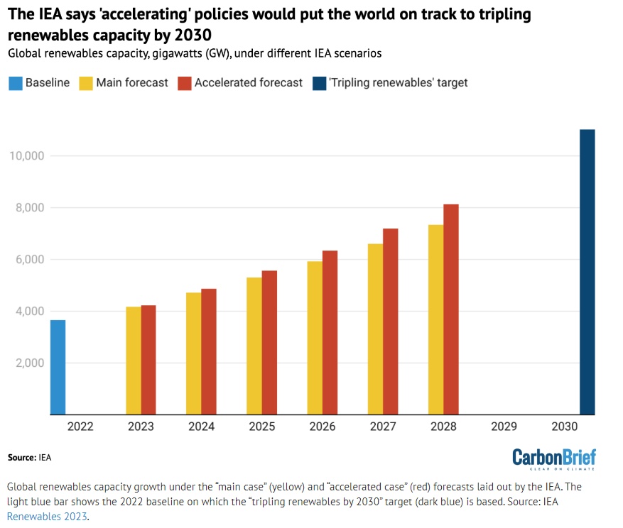 根据 IEA 的主要基线预测数据,在 2023-2028 年这六年期间,IEA预计全球将新增高达3,684GW的可再生能源装机容量规模,意味着全球可再生能源装机总量将是目前规模的大约两倍,按照IEA这一预测轨迹,预计到2030年,装机容量将至少达到9,000GW左右,大约增加到当前水平的2.5倍。IEA预测,到2028年,可再生能源发电将占全球发电总量的至少42%。