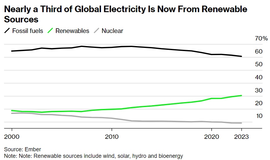 市场对于可再生能源股的追捧逻辑,主要在于全球脱碳化大趋势之下可再生能源或将是发电的最重要源头,甚至没有之一。能源智库Ember最新统计数据显示,由于风能和太阳能等可再生能源的扩张增长步伐继续远远超过煤炭等传统的化石燃料,去年可再生能源在全球电力规模中所占的份额升至创纪录的30%,该智库预计这一趋势将在今年将继续加速进行。